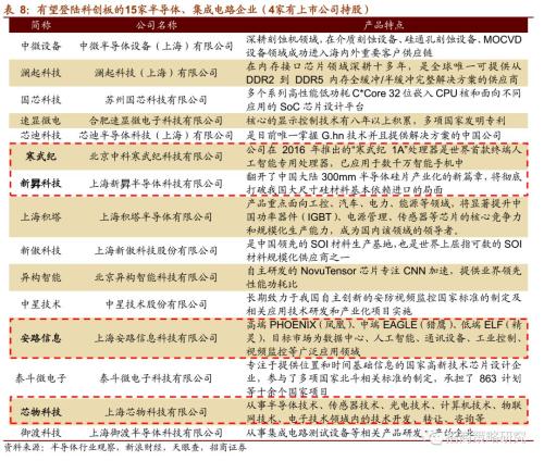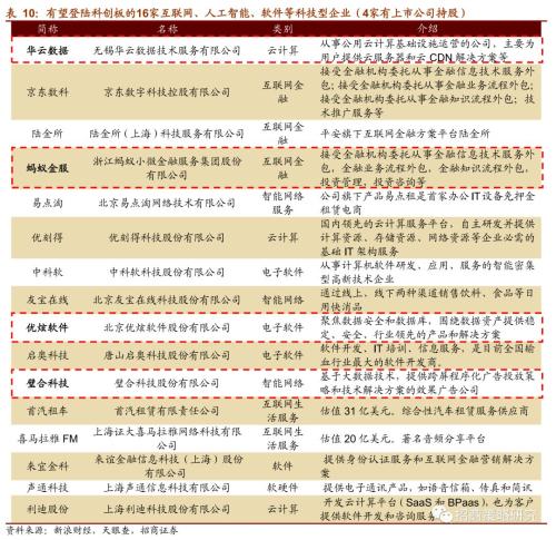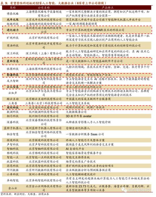 新一代信息技术:半导体、集成电路:寒武纪(科大讯飞(37.990,-0.26, -0.68%)持有1.52%)、新昇科技(上海新阳(31.990, 0.03, 0.09%)持有27.56%)、安路信息(士兰微(12.780, 0.11, 0.87%)持有4.34%份)、芯物科技(晶方科技(20.860, 0.18, 0.87%)、士兰微分别持有7.55%、4.72%)。人工智能、大数据:江南化工(7.080, 0.12, 1.72%)、奥飞娱乐(8.410, 0.29, 3.57%)持有光年无限13.7%、5%的股份,中科创达(38.370, 0.42, 1.11%)持有进化动力4.06%的股份,恒生电子(91.900,2.20, 2.45%)、信雅达(12.140, 0.29, 2.45%)分别持有星环信息4.53%、1.54%的股份,银河证券持有影谱科技2.42%的股份,佳都科技(11.780,-0.06, -0.51%)持有云从信息股份(11.57%),宣亚国际(28.320, -1.63,-5.44%)持有周同科技3%的股份。互联网、云计算、软件等:我们挑选了16家公司,其中4家有上市公司持股。