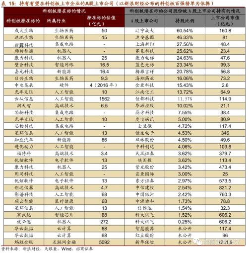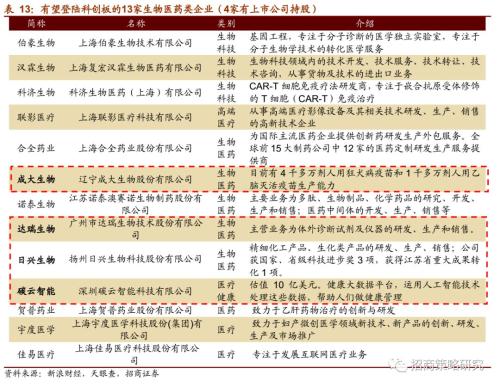 第四类生物医药类的企业主要包括生物技术、生物制药、化学药、医疗器械等,我们挑选了13家有望在科创板上市的公司,其中有上市公司持股的有4家。辽宁成大持有成大生物(新三板)60.54%的股份,达安基因持有达瑞生物(新三板)46.33%的股份,海翔药业持有日兴生物(新三板)16.06%的股份,中源协和持有碳云智能1.73%的股份。