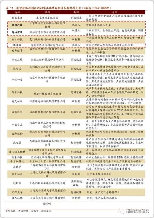 高端装备制造和新材料是券商推荐指引分类中的第二类行业,也是比较符合科创板胃口的“硬科技”行业,我们挑选的23家高端制造和新材料、机器人等公司中,有3家有上市公司持股。康力电梯、紫光股份分别持有康力科技24.63%、3.42%的股份,赛象科技持有廊坊智通25.62%的股份,科大讯飞持有优必选0.25%的股份。