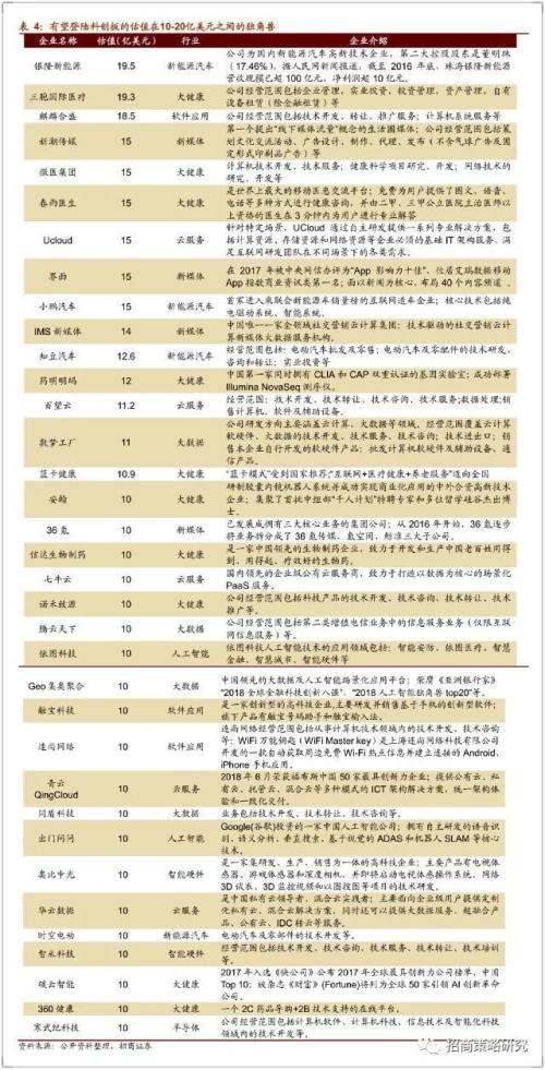 除了这16家以外,估值在10-20亿美元之间的拥有硬科技如新能源、大健康、大数据、云服务、智能硬件、软件应用等行业的独角兽企业,也有望在科创板上市融资,这34家企业总估值为419亿美元。