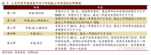 2018年12月1日上交所召集会员理事、监事召开的座谈会,据新浪财经报道,在研讨中,科创板发行上市标准或从五种维度来看。前四种是市值与收入、净利润、研发投入、现金流的组合,均在战略新兴板中出现过,第五种维度比较新也相对比较模糊,要求市值不少于40亿,主要产品或市场空间大。