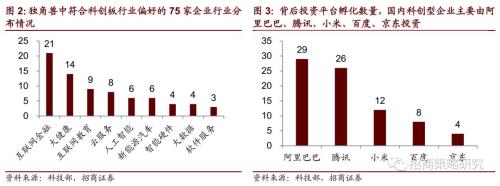 2017年科技部公布了164家独角兽企业,其中符合科创板行业偏好的的企业共有75家,它们集中在互联网、大健康、云服务、人工智能、新能源等领域,背后的投资平台为阿里巴巴、腾讯、小米等。