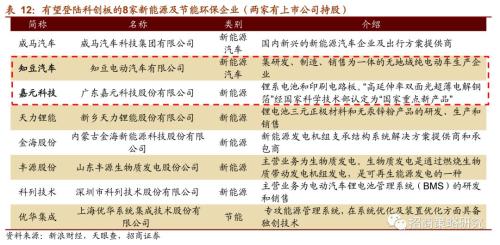 新能源及节能环保:满足最新的推荐指引的第三类新能源及节能环保行业的8家企业中,威马企业和知豆企业为新能源整车企业,嘉元科技等五家企业主营为锂电池材料、电池管理系统或生物质发电,优化集成为专攻能源管理系统的节能企业。其中有两家有上市公司持股,双林股份(11.660, 0.16,1.39%)持有知豆汽车4.5%的股份,梅雁吉祥(4.700, 0.43, 10.07%)持有嘉元科技(新三板)20.78%的股份。