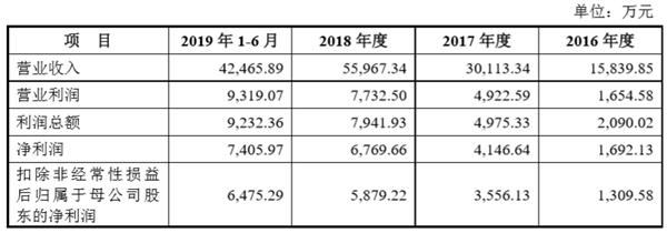 2016年度-2018年度及2019年上半年,公司实现收入分别为:15,839.85万元,30,113.34万元,55,967.34万元,42,465.89万元;同期净利润分别为1,692.13万元,4,146.64万元,6,769.66万元,7,405.97万元。