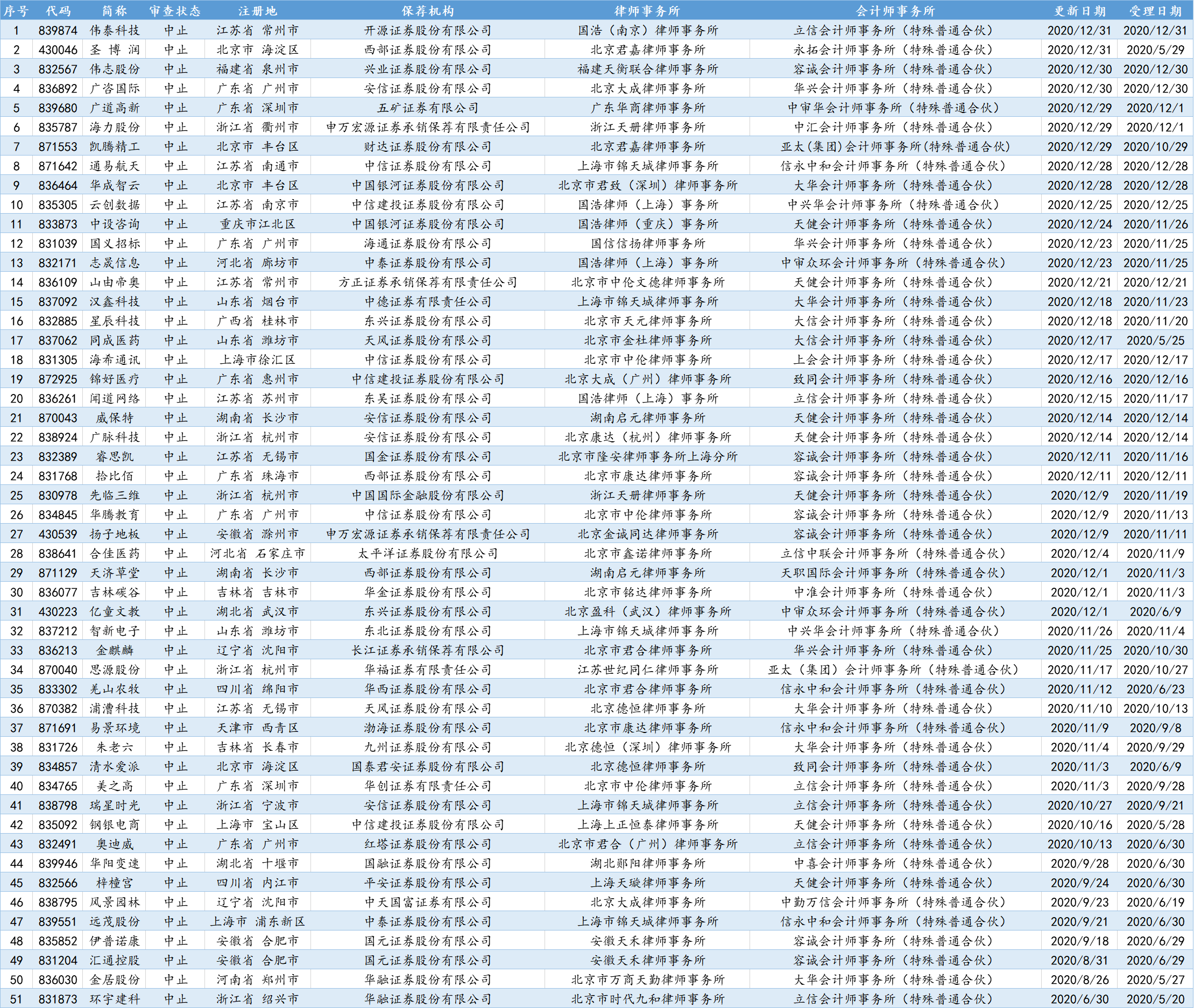 2020年12月31日-新三板报-北京消息,今天是2020年最后一个交易日,新三板精选层企业因财务报告有效期为问题,进入中止审查状态的企业达到51家。