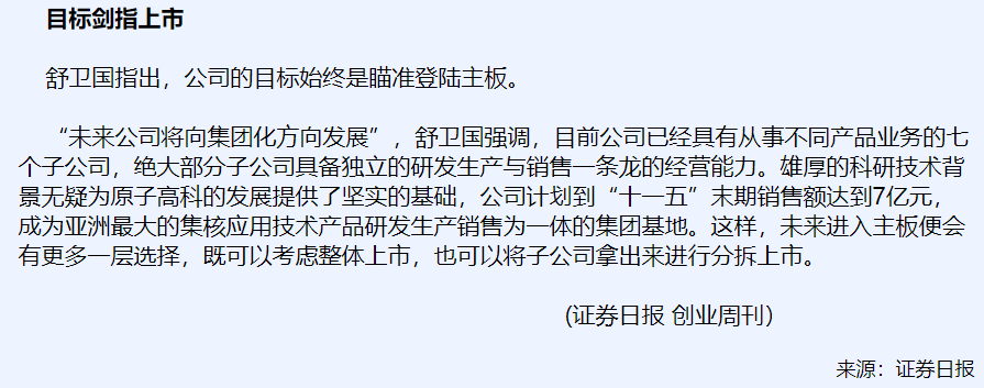 在同年,舒卫国接受了证券日报创业周刊记者独家专访,当时他表示,原子高科选择“新三板”的动机是为以后进入主板奠定基础。并表示,原子高科的目标始终是瞄准登陆主板。