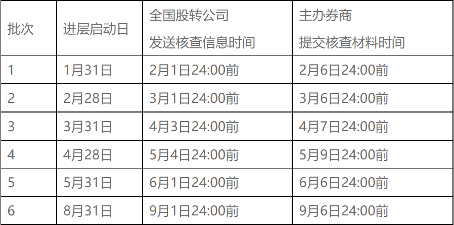 2023年,全国股转公司共拟实施6次创新层进层实施工作,分别以1月31日、2月28日、3月31日、4月28日、5月31日和8月31日为进层启动日,具体时间安排如下: