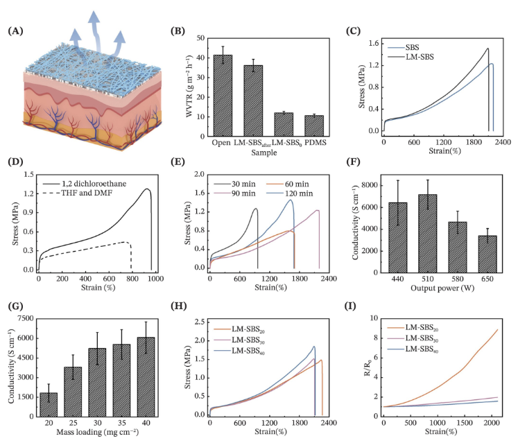 LM 被用作导电剂。LM 与无水乙醇混合后,被放入超声处理器(LS-1200B,中国远盛特)进行超声处理。LM 溶液通过吸过滤涂覆在电旋 SBS 薄膜表面。为了提升电性能,LM-SBS 复合薄膜的 LM 层被刷洗成均匀导电层。随后,为了提高渗透率,LM-SBS 薄膜通过 1000%应变的重复预拉伸 15 个周期激活。活化样品是透湿的 LM-SBS 薄膜。