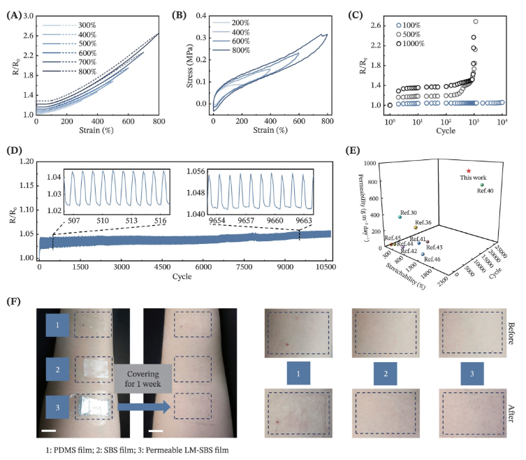 活化的 LM-SBS 薄膜在长期使用中表现出稳定性能,包括长期拉伸/释放、环境储存和皮肤接触。对于广泛拉伸,激活后的 LM-SBS 薄膜在变形后可获得长周期稳定性。LM-SBS 薄膜在 300%至 800%的循环应变间保持导电性(见图 2A)。