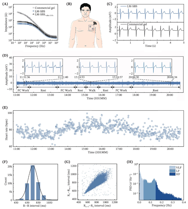 对人体实时和长期、持续心电图监测的需求非常强烈,尤其是心血管疾病患者。对于生物势感测,实现低且稳定的皮肤-电极接触阻抗对于捕捉高质量的电生理信号至关重要。图 3A 比较了 LM-SBS 导体与商业 Ag/AgCl 凝胶电极之间的界面接触阻抗。显然,LM-SBS 电极在 0.5–105 Hz(心电图/肌电图/脑电图信号所在频率范围内)表现出比商业 Ag/AgCl 凝胶电阻抗更低的界面阻抗。这是因为 LM-SBS 电极在保持良好附着于人体皮肤的同时,导电率明显高于商业凝胶。