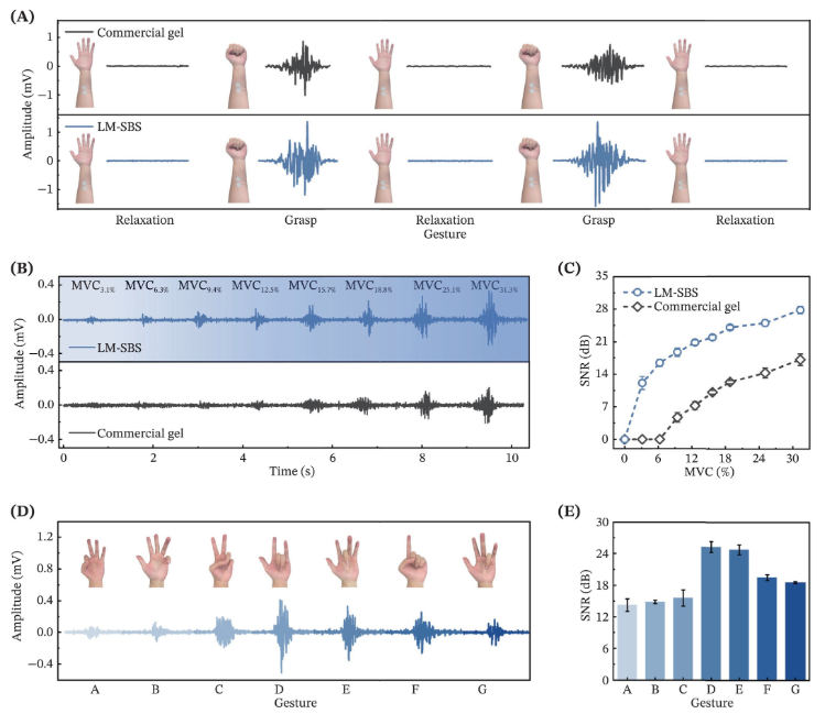 LM-SBS 电极的检测限为~3.12%,而商业凝胶电极的阈值更高,约为 9.44%,显示 LM-SBS 电极的灵敏度更高。如图 4C 所示,我们比较了两种电极类型捕捉到的 EMG 信号的信噪比(SNR),LM-SBS 电极的 SNR 高于商业凝胶电极。
