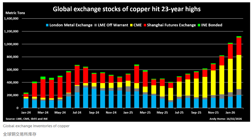 自1月初以来,全球交易所铜库存激增30万吨,表明铜价的超高速上涨抑制了制造业需求。